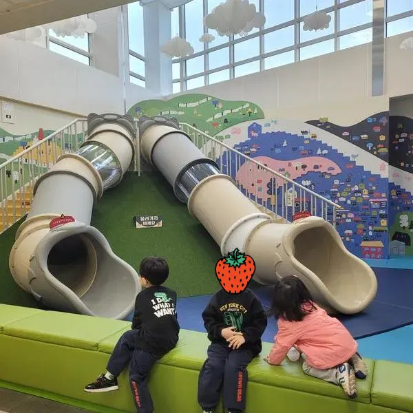 미끄럼틀이 두 개나 있는 실내 놀이터가 마련돼 있어 아이들이 신나게 뛰어놀 수 있었어요.